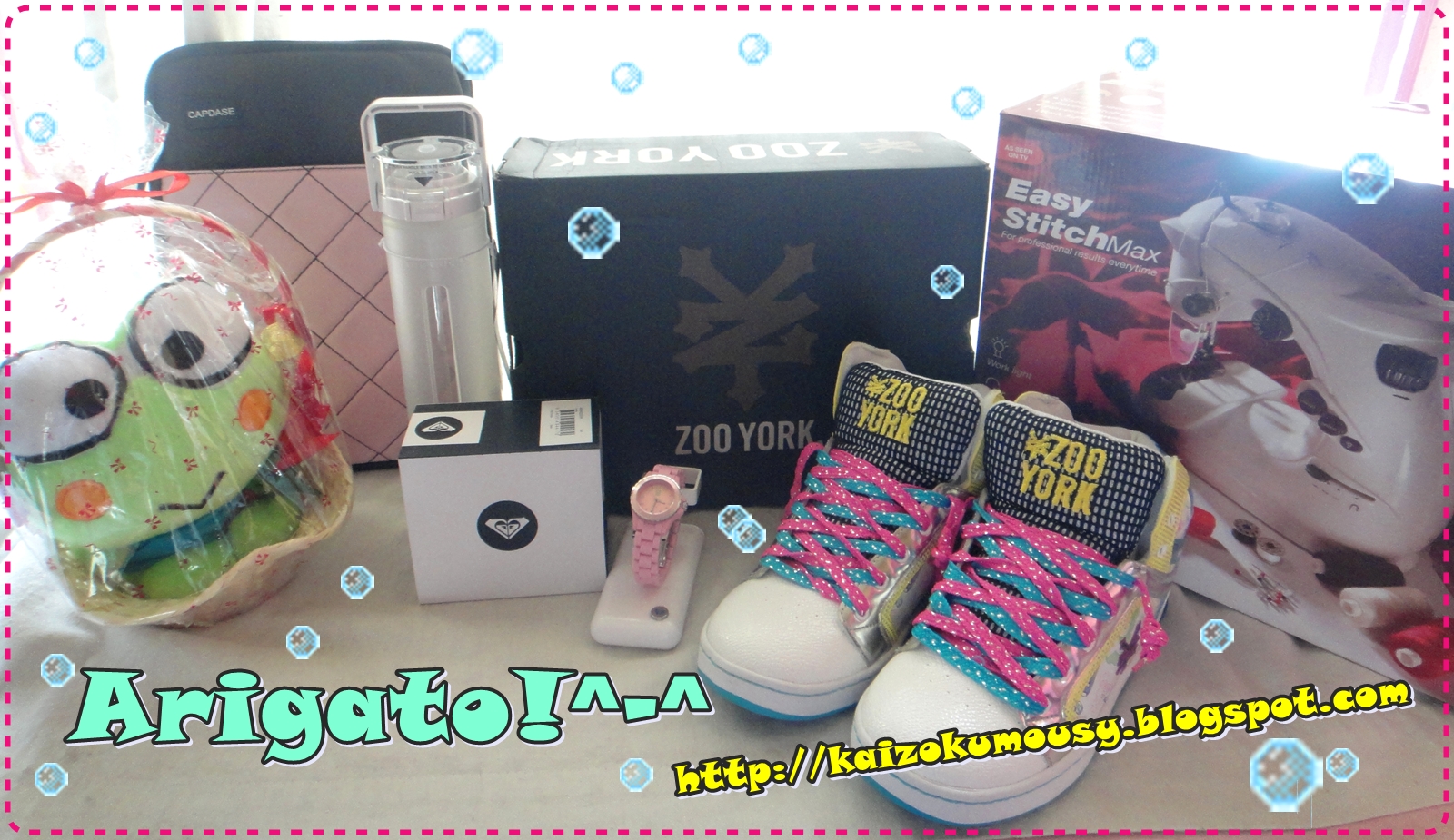I received a a Capdase laptop case,Zooyork rubber shoes,Roxy watch,Starbucks glass water bottle, a Sewing machine ,and kerokero plushie.<3 nbsp="nbsp" p="p">